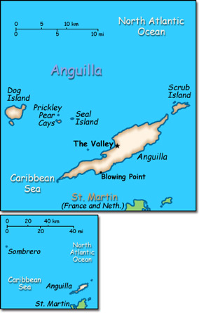 Official Name: Anguilla Location: Caribbean, islands between the Caribbean Sea and North Atlantic Ocean, east of Puerto Rico. Capital: The Valley