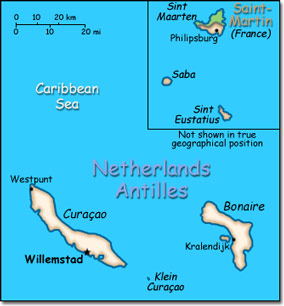 Official Name: Netherlands Antilles Location: Caribbean, two island groups in the Caribbean Sea - one includes Curacao and Bonaire north of Venezuela; the other is east of the Virgin Islands. Capital: Willemstad, CuraƧao Island