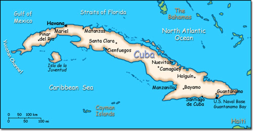 Official Name: Republic of Cuba Location: Caribbean, island between the Caribbean Sea and the North Atlantic Ocean, 150 km south of Key West, Florida. Capital: Havana