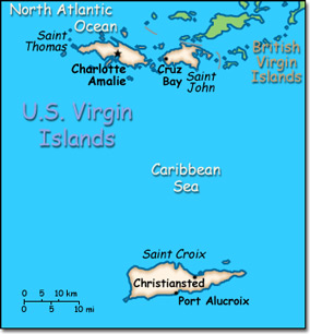 Official Name: United States Virgin Islands Location: Caribbean, islands between the Caribbean Sea and the North Atlantic Ocean, east of Puerto Rico. Capital: Charlotte Amalie on St. Thomas Island
