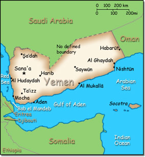 Official Name: Republic of Yemen Location: Middle East, bordering the Arabian Sea, Gulf of Aden, and Red Sea, between Oman and Saudi Arabia. Includes Perim, Socotra, the former Yemen Arab Republic (YAR or North Yemen), and the former People's Democratic Republic of Yemen (PDRY or South Yemen). Capital: Sanaa